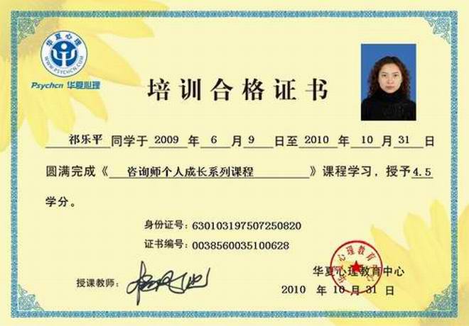 心理咨询师个人成长培训合格证