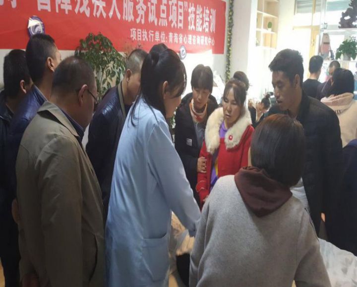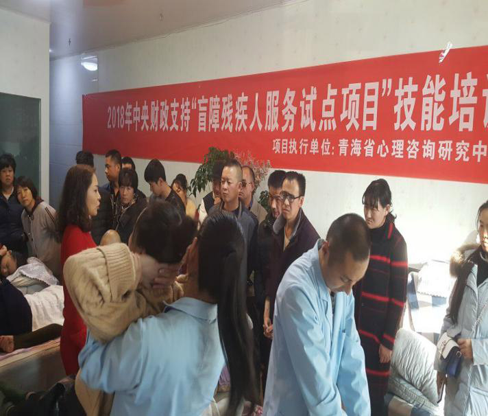 2018年11月中旬,青海省心理咨询研究中心组织省残联、省特校以及各盲人按摩店联系,分别在顾式盲人按摩店、青海仁和按摩医院和亚云按摩店内举办青海省心理咨询研究中关《2018年中央财政支持社会组织参与社会服务项目》里“盲障残疾人服务试点项目”受益对象盲障残疾人按摩技能提升体验活动。活动特邀省仁和按摩医院的保健按摩医师团队、顾式按摩医院的按摩医师顾明、亚云按摩医院的的5位医师分别为授课。来自省残联、省特校以及各盲人按摩店的视力残疾人参加了此次盲人按摩体验培训。